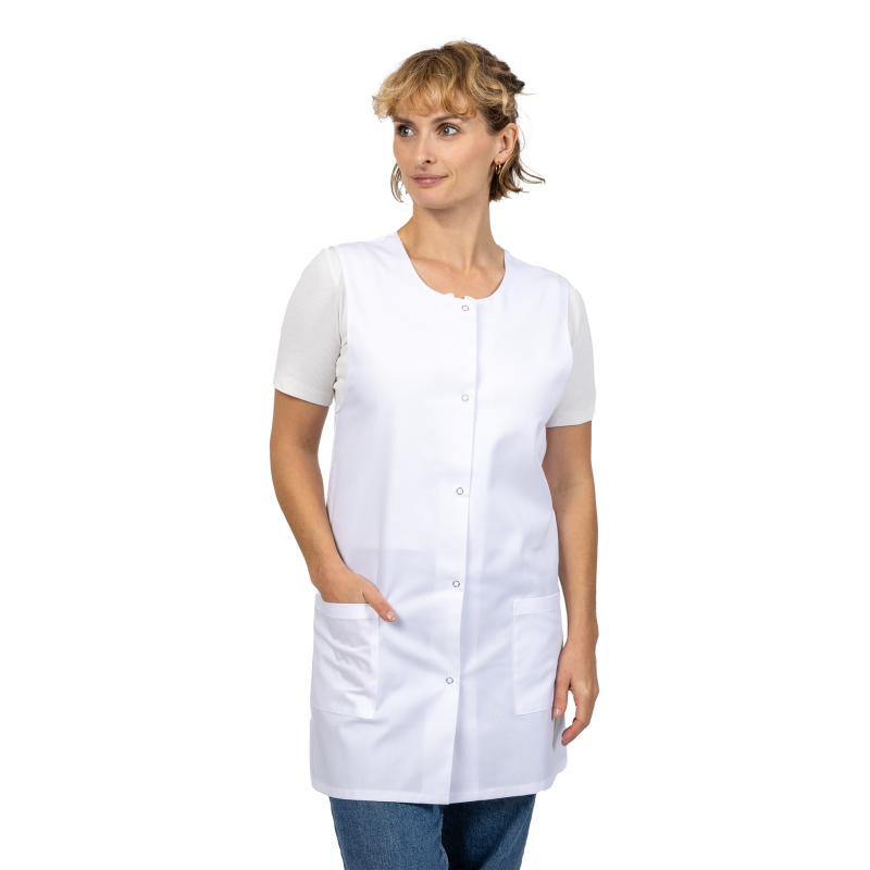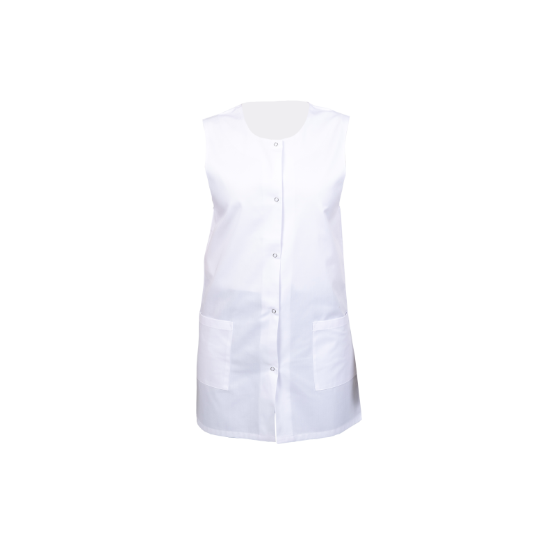 BLOUSE SANS MANCHE COMPOSITION : Polyester/coton 65/35 sergé 200gr/m² COLORIS : blanc TAILLES : Taille S à 2XL CARACTERISTIQUES : Col arrondi, 2 poches...
